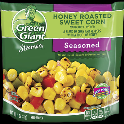 Sweet Corn, Honey Roasted, Seasoned, Steamers, Bag 11 OZ A blend of corn and peppers with a touch of honey. Naturally flavored. No artificial flavors or preservatives. Box Tops for Education. Per 3/4 Cup Frozen: 80 calories; 0 g sat fat (0% DV); 180 mg sodium (8% DV); 6 g sugars. Green Giant makes it easy to be good to yourself. Each vegetable variety is crafted to give you a unique taste experience - seasoned to delicious and ready in just minutes.
