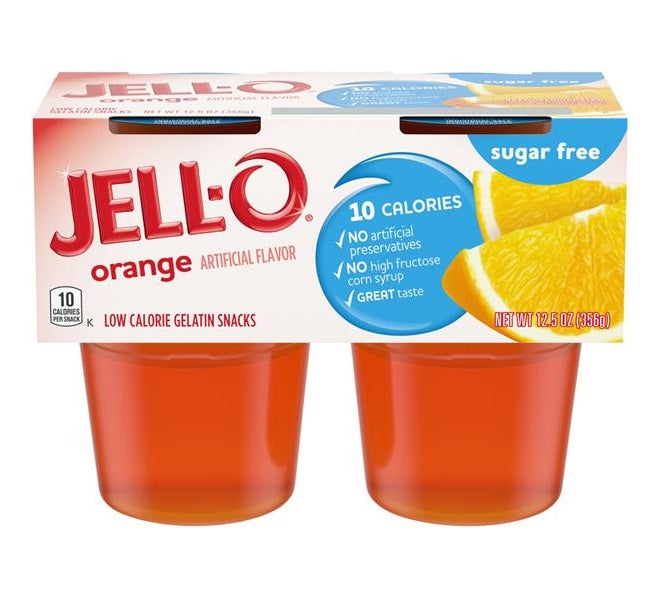 Jell-O Sugar Free Ready to Eat Orange Gelatin delivers the great taste of Jell-O Gelatin in a low-calorie choice. This delicious on the go treat comes in individual snack cups, perfect for sneaking into a lunchbox or snacking at home. These jiggly Jell-O cups make a scrumptious snack for kids and adults alike. The citrusy orange gelatin is fat free and sugar free, with 10 calories per serving. This gelatin snack is made without artificial preservatives and is great for those keeping Kosher. Each sleeve contains four Jell-O Ready to Eat Orange Gelatin cups for quick and easy snacking. Each low calorie gelatin cup is individually sealed to ensure freshness.