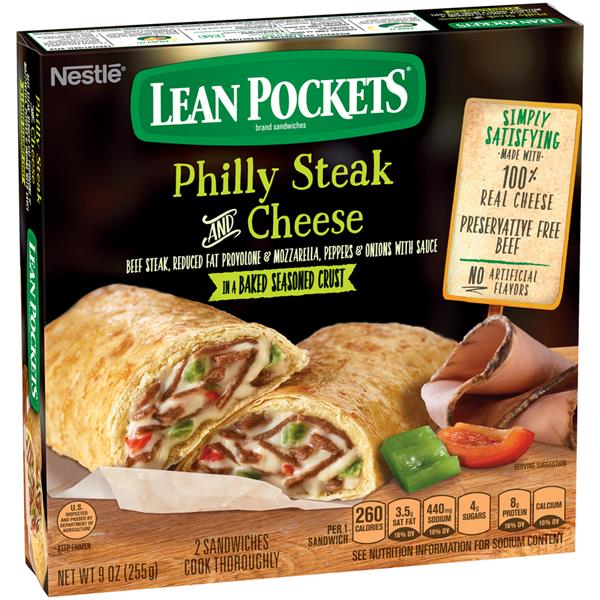 Get fired up with the protein and fuel of mouth-watering LEAN POCKETS Frozen Sandwiches Philly Steak & Cheese 2-Pack. Made with premium meats, 100% real cheese that’s made in the USA and no artificial flavors. Now that’s legit.