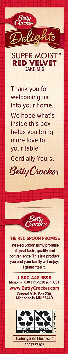 Betty Crocker SuperMoist Red Velvet cake mix with pudding right in the mix. Easy to prepare; just add water, oil, and egg. Betty Crocker SuperMoist cakes are today's family tradition, for special occasions and those spontaneous celebrations when only "homemade" will do. Kosher Dairy.