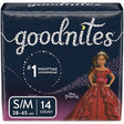Help your child wake up dry with the #1 Nighttime Underwear* for bedwetting. Goodnites provide the best nighttime protection guaranteed** for kids age 3-12. These disposable pants feature Double Leg Barriers to help eliminate leaks and 5 Layer Protection to absorb & lock away wetness. Goodnites also feature a super stretchy waistband for a comfortable, underwear-like fit that accommodates all body shapes. Unlike training pants, Goodnites bedwetting underwear discreetly absorb odor and offer 40% more protection*** where she needs it most. Plus your child will love going to bed wearing her favorite Disney princess designs. Goodnites for Girls are available in sizes XS (28-45 lb.), S/M (38-65 lb.), and L/XL (60-125+ lb.). *Youth Pant Category ***vs. the leading training pant