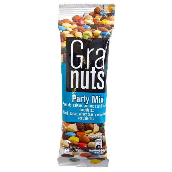 PARTY MIX: Flavorful mix of peanuts, raisins, almonds, and chocolate coated candies HEALTHY + DECADENT: Gluten-Free, a natural source of protein, fiber, and antioxidants SATISFYING SNACK: 1.41 ounce bags of both salty & sweet flavors, with a chocolate crunch! A favorite for kids after school snacking, it's a party! CONVENIENCE: Easy to carry, on-the-go packaging perfect for busy days, biking, hiking, and school lunches NATURAL ENERGY: Recommended for athletes based on the balanced nutrition and healthy source of energy