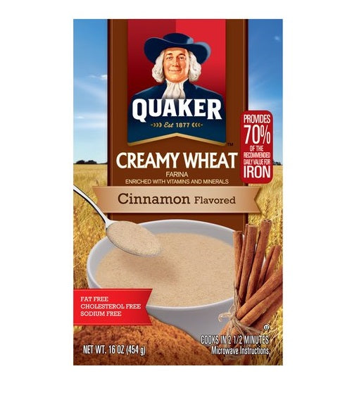 Quaker Creamy Wheat Cinnamon. Quaker Cinnamon Flavored Creamy Wheat. Est 1877. Farina. Enriched with vitamins and minerals. Provides 70% of the recommended daily value for iron. Fat free. Cholesterol free. Sodium free. Cooks in 2 1/2 minutes. Microwave instructions. Our guarantee your money back if not satisfied. 2012 The Quaker Oats Company.
